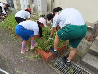 小学校の高学年が全体の進行を行い、小・中学校の縦割り班に分かれて花壇の草むしりを行いました。