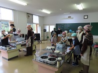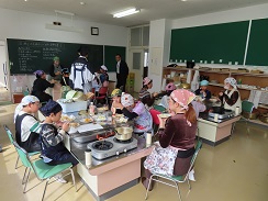 10月22日(水)、小学3・4年生が総合的な学習の時間に取り組んでいる「松ヶ崎(佐渡)を感じるお弁当作り(正式名称は検討中)」の試作として、柿を使ったメニューの調理に取り組みました。