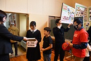 休憩時間には、中学生が赤い羽根共同募金を呼び掛けました。