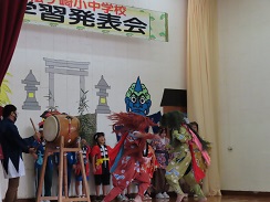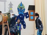 地区によって鬼太鼓の打ち方はかなり異なります。さらに、小学校低学年のかわいらしい鬼や中学年の元気な鬼、高学年の格好いい鬼に中学生の迫力のある鬼と、個性豊かな発表に大きな拍手がおこりました。