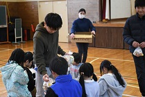 最後に、二人の年男が、豆入りお菓子セットをみんなに配りました。